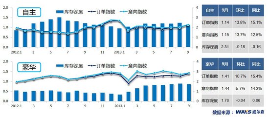 时下正是“金九银十”,在整个市场气氛热烈的背景下,自主品牌表现亮眼,终端订单、意向升幅环比超过了合资品牌和豪华品牌,库存深度降幅亦较后两者大。长城汽车的哈佛H系列持续热卖,订单量环比增加10.2%。上海汽车在9月推出荣威350的新优惠政策,经销商也加大了热销车型的优惠,拉动订单量环比上涨13.4%。