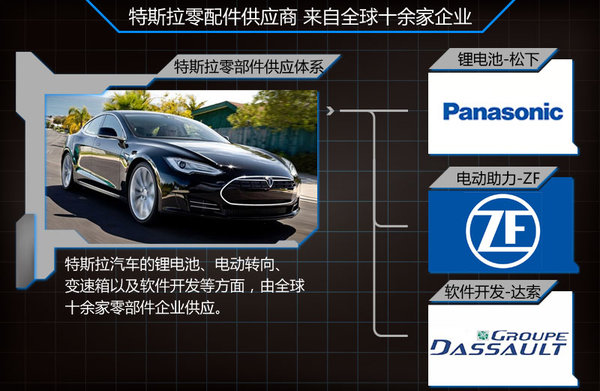特斯拉旗下的在售车型Model S,采用全球零部件供应商的采购模式,通过企业所指定的标准,让合作供应商按照要求进行生产,从而通过高性价比的方式完成组装。其中锂电池、电动转向、变速箱以及软件开发等方面,便是由全球十余家零部件企业供应,包括松下、ZF、博格华纳、达索系统等。此次,特斯拉汽车将与国内零部件企业沟通相关事宜,长信科技有望成为中国首个为特斯拉提供核心零部件的供应商。
