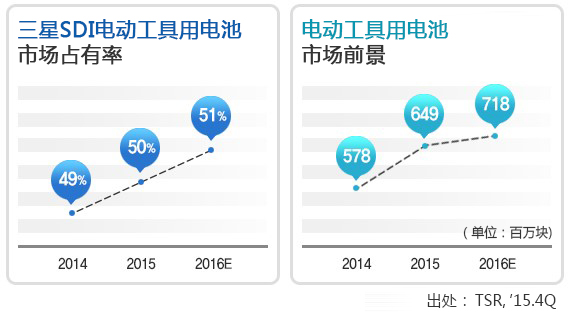 在电动工具市场,三星SDI的技术实力受到认可之后,TTi, Stanley Black & Decker, MAKITA等电动工具全球主流企业都向三星SDI的电动工具用电池伸出了橄榄枝。截止去年,向4大主流企业出售的电动工具用电池突破9亿块。如此骄人的成果,使得三星SDI成为电动工具用电池市场的第一。曾经由日本企业占据的电动工具市场,现在三星SDI的占有率已经达到50%。