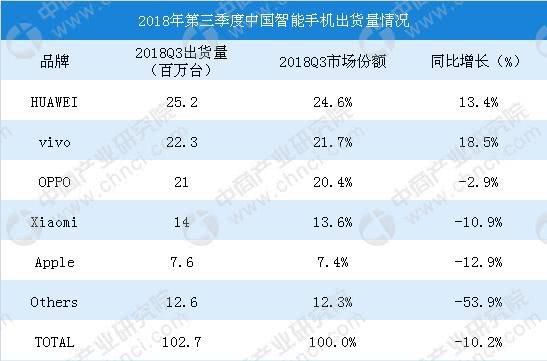 这一数据和全球IDC公司的最新数据相吻合。IDC公司的统计显示,2018 年第三季度全球智能手机出货 3.552 亿台,同比下降 6%,连续四个季度下滑,我国智能手机出货 1.027 亿台,同比下降 10.02%,连续六个季度下滑。