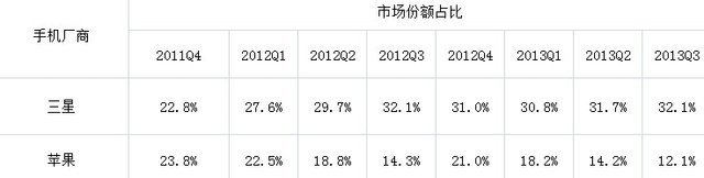 根据 Gartner发布的最新数据显示,今年第三季度,三星智能手机出货总量达到8035.7万部,市场份额达到32.1%;苹果出货总量达到3030万部,市场份额达12.1%,而从第三名的联想开始,市场份额均滑落到5%以下,与三星、苹果的两家独大,形成鲜明对比。