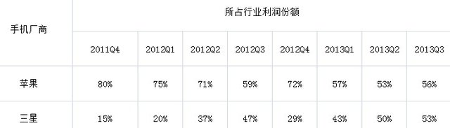表二:近八个季度苹果、三星所占智能手机行业利润百分比(数据来源:Canaccord Genuity)