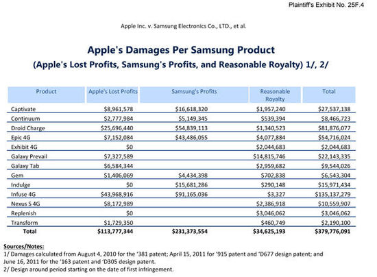 在提交给陪审团的三星侵权产品图表中,苹果着重指出了两款销售额最高的手机设备,包括Infuse4G(累计销售额1.35亿美元)和Droid Charge(8100万美元),这两款手机目前已经在美国地区下市。