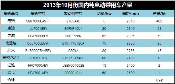 2013年10月份国内纯电动乘用车总产量692辆,其中奇瑞482辆,占比70%以上;其次是康迪93辆,占比13%;荣威、比亚迪、北京、赛欧依次占比9%、4%、2%、2%,江淮和哈飞最少,总共就3辆。