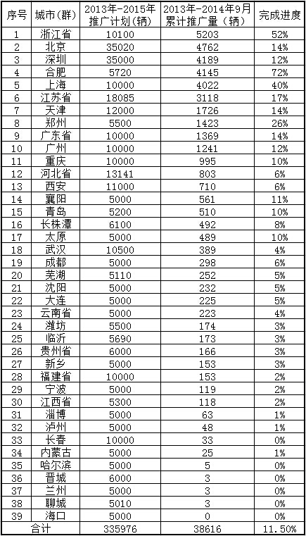 按照新能源汽车推广应用城市(群)申报计划,2013年至2015年39个推广应用城市(群)将累计推广新能源汽车33.6万辆。截止到2014年9月,我国共推广新能源汽车38616辆,仅完成计划的11.5%。