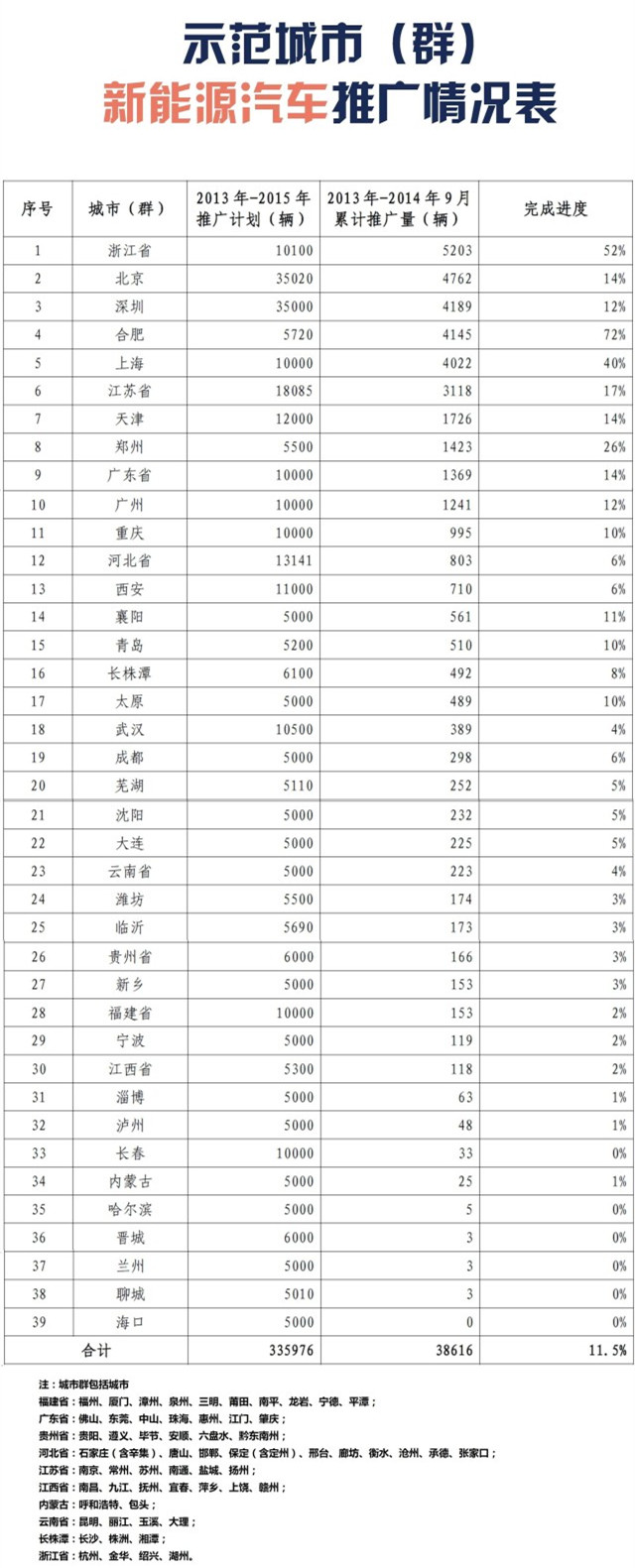 2013年9月,《财政部、科技部、工业和信息化部、发展改革委关于继续开展新能源汽车推广应用工作的通知》(财建〔2013〕551号)印发。根据各地新能源汽车推广应用方案申报情况,财政部、科技部、工业和信息化部、发展改革委分别于2013年11月、2014年1月发布了两批新能源汽车推广应用城市(群)名单,共39个城市(群)88个城市列入新能源汽车推广应用城市(群)。按照新能源汽车推广应用城市(群)申报计划,2013年至2015年39个推广应用城市(群)将累计推广新能源汽车33.6万辆。