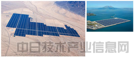 美国第一太阳能供应太阳能电池的加利福尼亚州发电站(左)。发电输出功率为55万千瓦,属于全球最大级别。日本国内最大级别、输出功率为7万千瓦的鹿儿岛市七岛太阳能发电站。