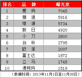 2013年11月份《电动自行车行业品牌网络营销口碑指数榜》数据于12月上旬正式发布。此次口碑榜是对各品牌11月份媒体曝光度、用户关注度、产品关注度,以及标题浮现率等相关数据的综合统计,并对各品牌在行业内的口碑及各自影响力的变化进行了动态评估。