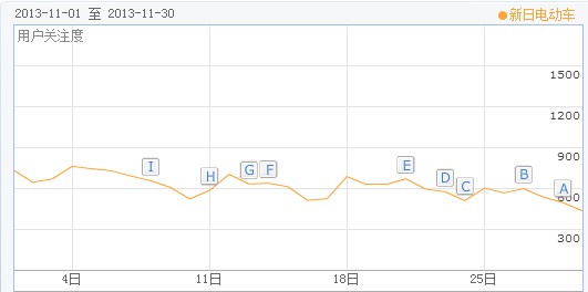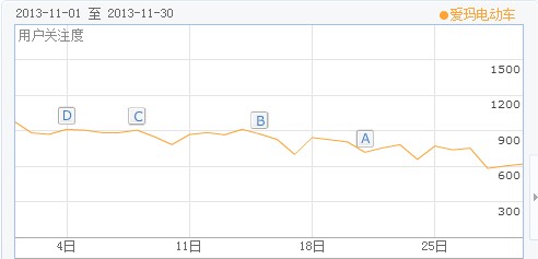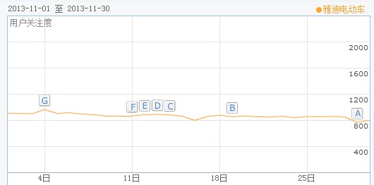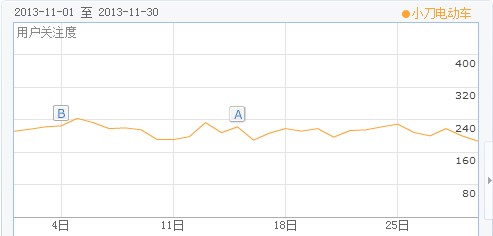 另外,雅迪的标题浮现率仍然保持在高水平,100%的标题浮现率充分表明了雅迪在网络营销推广方面愈益成熟。十一月份雅迪在产品宣传上主要集中在聚能王系列的宣传推广,聚能王针对冬季市场的抗寒特性,使雅迪在北方市场应对淡季策略方面领先于其他品牌。加上雅迪3699万独家冠名《CCTV家庭幽默大赛》,以及在巴西展的突出表现,这些都在很大程度上推升了雅迪十一月份的品牌关注度。据百度指数显示,雅迪十一月份的用户关注度接近867分,位列行业第一。