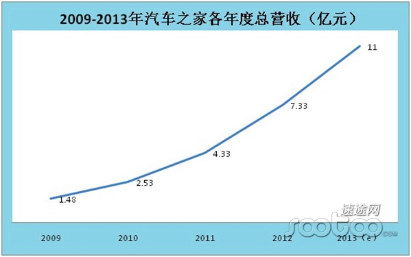速途研究院整理了汽车之家从2009年至2013年(根据汽车之家前三季度的营收估计)营收的具体情况。2009年汽车之家的营收仅为1.48亿元,2010年则增长了近70%,达到了2.53亿元。2011年营收4.33亿元,2012年营收则达到了7.33亿元。预计在2013年全年营收将会达到11亿元,与2012年同期相比增长近60%。从营收增长总体来看,汽车之家平均每年复合增长率近70%,这也为其上升提供了有力的市场和财务依据。