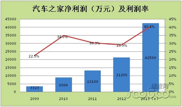 从汽车之家招股书来看,其利润和利润率相较于2009年都有显著提高。2009年净利润仅为3323万元,而到了2012年净利润则达到了2.12亿元。2013年前三个季度净营收为3.335亿元,预计在2013年全年净利润将达到4.25亿元,与去年同期相比净利润增长100.47%。在利润率方面,2009年净利润率最低,为22.5%,2010年则达到34.8%,2011年30.3%,2012年28.9%,预计在2013年净利润率将达到40.4%。净利润率增长的主要原因在于汽车之家管理的优化以及目前汽车制造商和代理商在互联网上的费用投入增长和网络营销费用的提升。