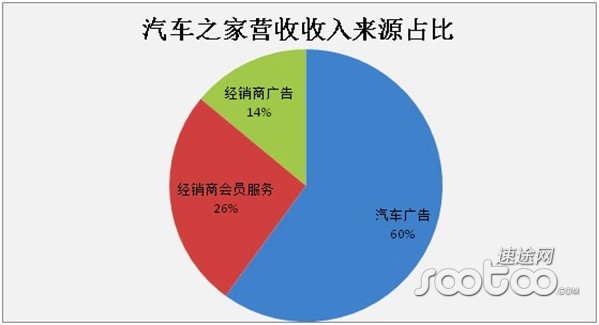 速途研究院整理了汽车之家的营收来源,从整体来看汽车之家主要收入来自于汽车广告业务,占比达到了60%。其次是经销商会员服务,收入占比为26%,最后是经销商广告收入,占比为14%。