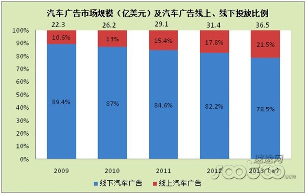 但是,从2009年至今,线上广告市场的投入比例在不断扩大。2009年,我国汽车广告市场规模为22.3亿美元,其中线上占比10.6%,线下占比高达89.4%。到了2012年,汽车广告市场规模31.4亿美元,线上广告占比为17.8%,线下广告占比则缩小至82.2%。预计在2013年市场规模将会达到36.5亿美元,而线上比例将会达到21.5%,线下比例将进一步缩减至78.5%。随着汽车厂商不断的打通线上交易环节,线上广告投入将会进一步扩大, 未来线上、线下广告投入比例的差距将会进一步缩小。