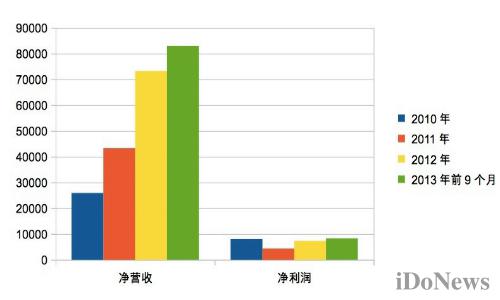公司净营收从2010年至2012年,三年间的净营收年复合增长率达62.7%,截止2013年9月30日的前三季度,公司净营收8.306亿元,较去年同期5.108亿元,同比增长62.6%。