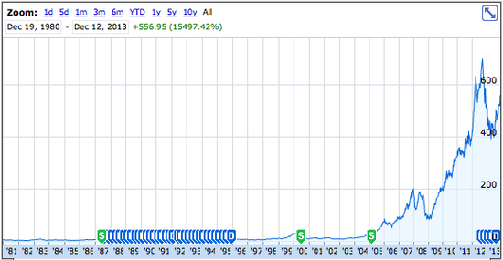 据国外媒体报道,苹果于1980月12月12日首次公开招股(IPO),发行价22美元,共计出售了460万股股票。这次IPO融资额度高于自1956年福特汽车(Ford Motor)上市以来任何一次IPO融资规模,并且当时立即创造了300位百万富翁。