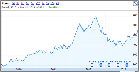 在2010年代最初的4年,苹果股价创下新高并且该公司开始支付股息,同时回购公司股票。