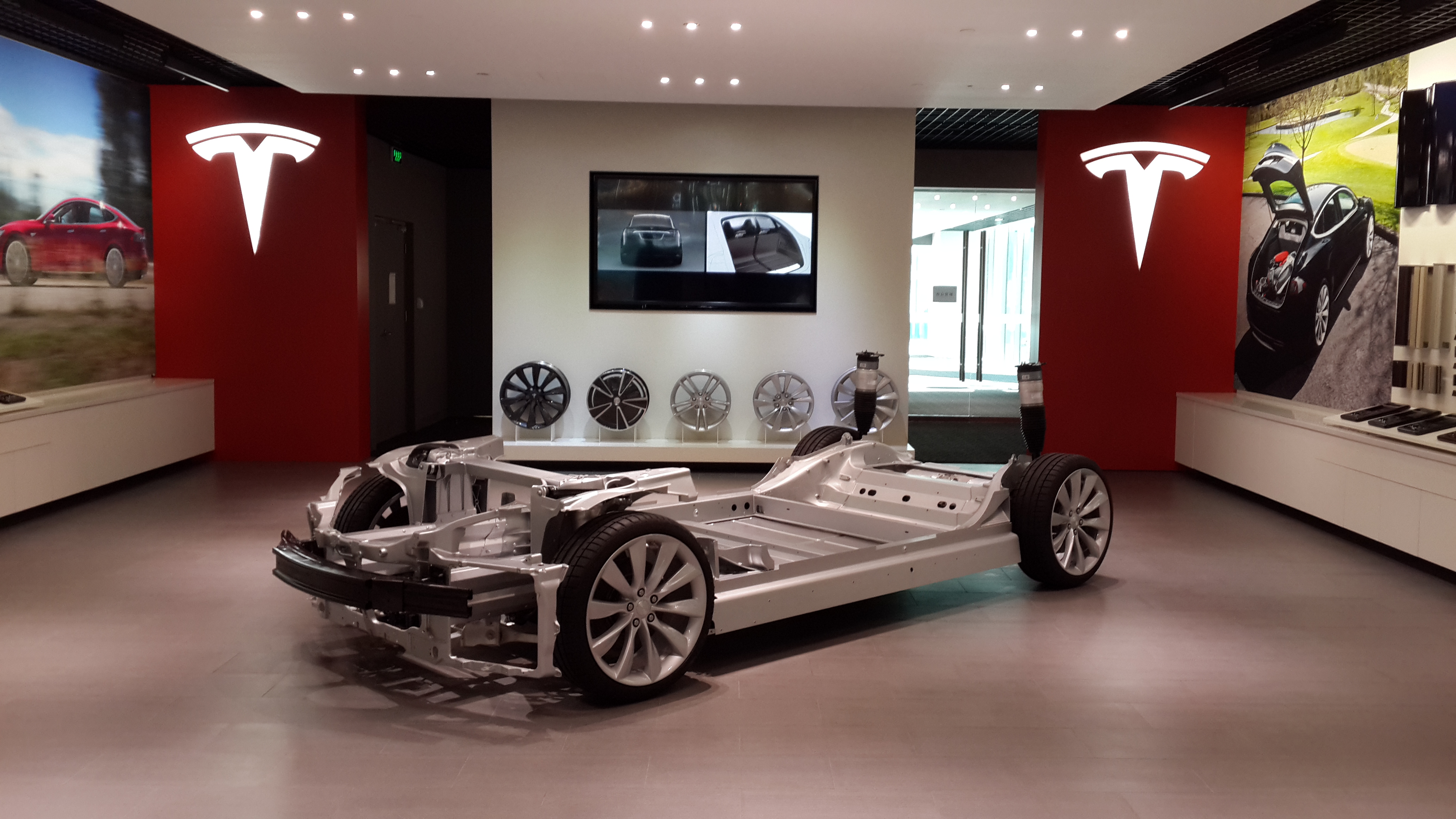 清媒煮9报道团目测该体验店装修简陋,无法与同价位豪车的4S店相比。现场展示区域约400平米,进门即为目前中国市场唯一的一款Tesla Model S展车,展车后有一Tesla Model S的实车车架,车架中间部分是一整片白色铝合金,据称Tesla Model S的电池就在白色铝合金下面。由于没有发动机,Tesla Model S的前舱空空如也,实车成为一个新的储物箱,试想打开前舱盖,将行李丢入其中,然后触屏启动汽车,不知客户是倍感新奇,还是不蛮适应。