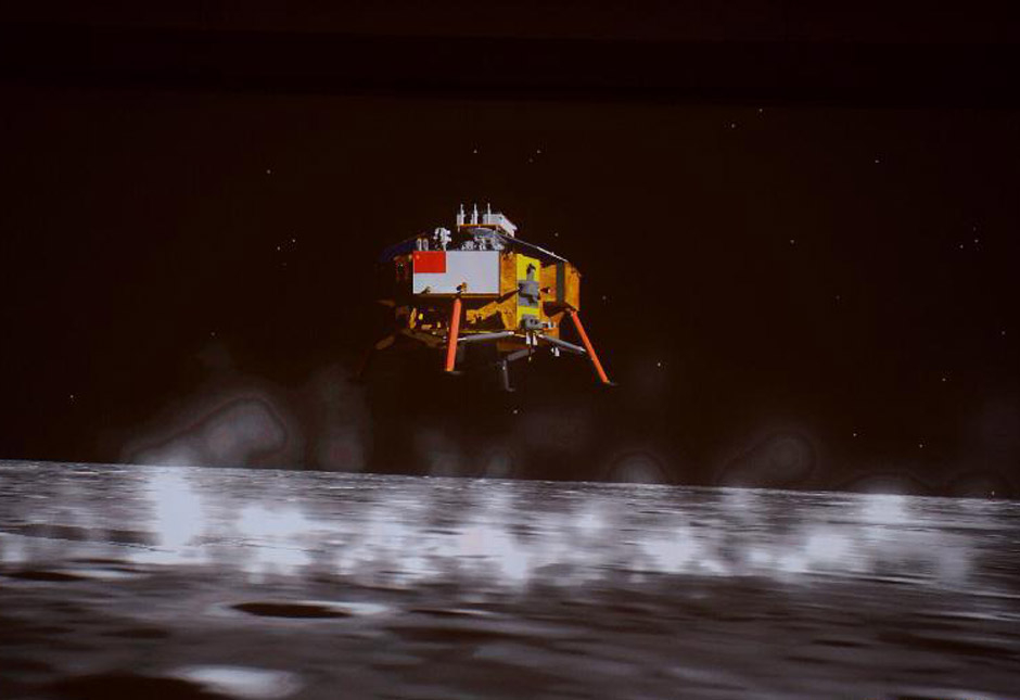 从15公里高度开始的。大约12分钟的落月过程中,嫦娥三号依靠自主控制,经过了主减速段、快速调整段、接近段、悬停段、避障段、缓速段等6个阶段,相对速度从每秒1.7公里逐渐减为0。在距离月面100米高度时,探测器暂时停下脚步,利用敏感器对着陆区进行观测,以避开障碍物、选择着陆点。在以自由落体方式走完最后几米之后,平稳“站”上月面的4条着陆腿触月信号显示,嫦娥三号完美着陆月球虹湾地区。
