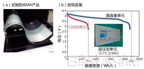 积水化学开发出了可利用涂布工序制造的锂离子充电电池(a)。试制的层压型单元实现了900Wh/L的能量密度。(图(b)由《日经电子》根据积水化学的资料制作)