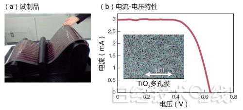 以前,在基板上涂布含TiO2的膏状物的电池需要在500℃左右的高温下进行烧结,由于耐热性的问题,此前难以在通用薄膜上实现色素增感电池。