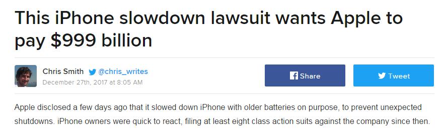 苹果“电池门”事件让全世界广大的使用者感到相当不满,许多媒体也认为苹果的处理的方式确实不恰当,许多果粉“信心受创”也展开提告。
