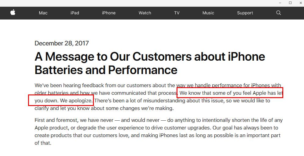 台湾《自由时报》12月29日报道称,苹果声明称,“我们知道你们中一些人觉得苹果让你们失望了,我们深表歉意。目前有很多对于此事的误解,所以我们想澄清,让你了解我们正在做出一些改变。”