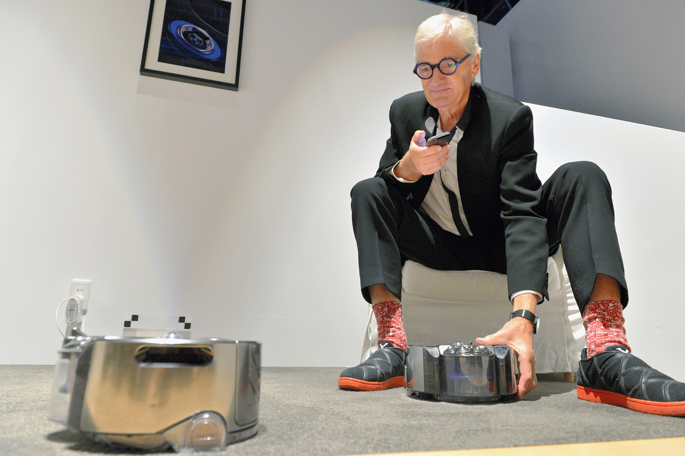 戴森公司创始人兼董事长詹姆斯·戴森在东京展示机器人吸尘器“戴森360 Eye”