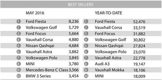 英国车市上月畅销车型榜单中,福特嘉年华(Fiesta)销量排行第一,达8,236辆;大众高尔夫销量为5,729辆,位列第二;福特福克斯紧随其后,销量达5,664辆,位居第三。