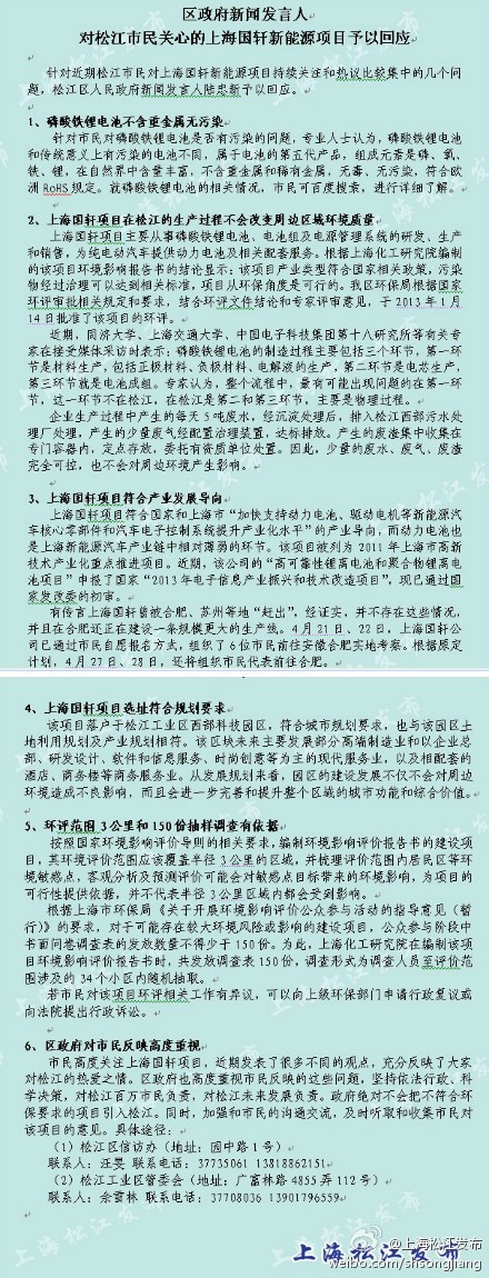 图说:松江区政府关于国轩新能源项目的回应微博。