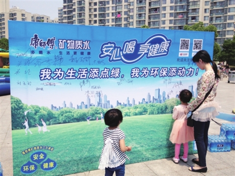 活动现场设有环保签名墙,凡在上面签上自己姓名的市民都可获得康师傅550ml矿水一瓶。为了使环保活动更加深入人心,现场市民可以拿废旧电池兑或者康师傅饮料空瓶换矿物质水。“我为生活添点绿”系列环保主题活动自5月1日在世茂运河城广场开始以来,受到市民广泛关注。在这为期一个多月的环保季特别活动中,陆续展开了环保跳蚤市场、主题涂鸦赛、汽车环保主题展、创意改造集市、康师傅环保主题日等多个活动,旨在倡导人们绿色、健康的生活理念,让生活更美好。