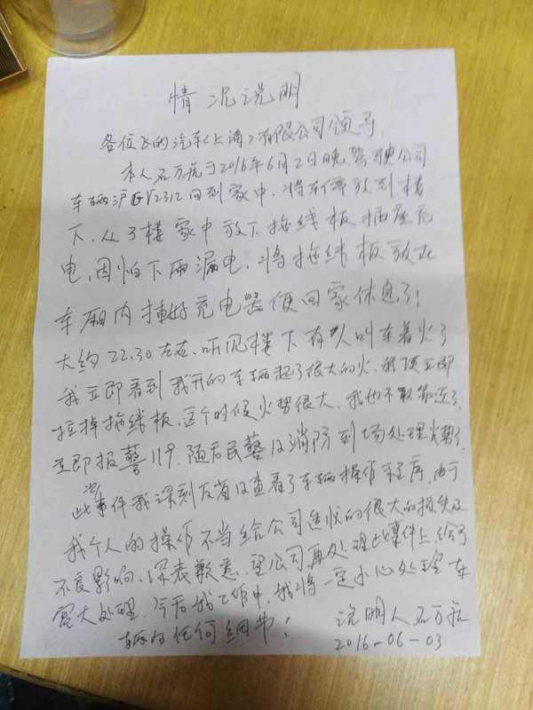 就在事件发生不久后,当事人石先生承认了事故是由于自己充电操作不当而导致火灾。于是石先生手写了一张情况说明。