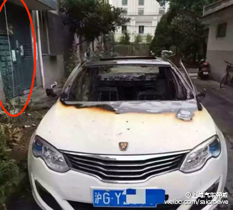 从事故现场图片来看,这辆牌号为沪G Y的荣威e550主要为车身内饰燃烧,车头发动机部分并没有起火。