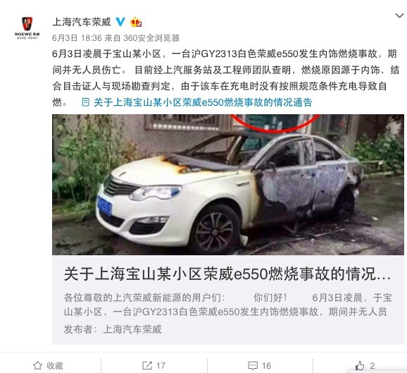 (图为上汽荣威通告内容:电池包未发生爆炸)