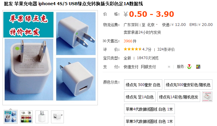 绿点充电器最常见出现在美版的iPhone包装里,在充电器上有一个绿色的小点,所以被称之为“绿点充电器”,优点是体积小巧,所以很多朋友都喜欢。除了美版之外,还有欧规绿点充电器以及超薄的美规/欧版充电器。绿点充电器的流行也导致了大量深圳的山寨货出现,如果你去华强北走一遍,会发现批发店铺绿点充电器多如牛毛,而在阿里巴巴等平台也可以看到批发销售,2、3元一个,如此价格,能有什么质量保障?