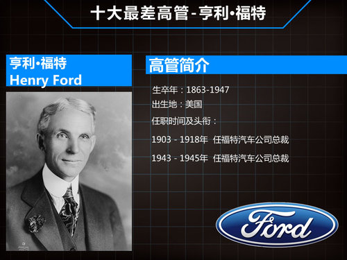 车企老大向来是我们关注的焦点,他们所掌控的公司动辄上千亿的汽车产业以及相关的上下游零件、物流业,不仅改变着世界每一个人的生活方式,也是全球经济链条上重要的一环。美国《财富》杂志评选出了史上10大最差车企掌门人,这十个位高管均来自福特、克莱斯勒、通用、德劳瑞恩、戴姆勒以及菲斯克等欧美汽车公司,并且其中不乏福特汽车公司创始人亨利·福特等杰出人才。这些知名历史人物何以被冠上“最差CEO”的头衔呢?网通社通过查阅相关资料,对这十位高管的历史背景也有了一定了解,通过梳理我们发现:统帅一个公司的顶级高管更需要综合素质的体现,如果不是“天才”那么真的很难向历史交出满意的答卷。