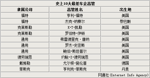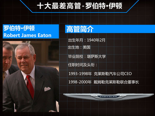“最差CEO”原因:错误的决策。分析人士指出,他促成戴姆勒和克莱斯勒的联盟使得克莱斯勒遭遇了危机