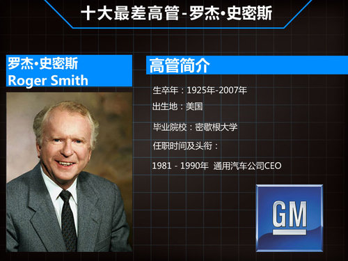 史密斯(1925年-2007年)1947年在密歇根大学取得企业管理学士学位,1953年取得同所大学的企业管理硕士学位,曾于1944 到1946年间在美国海军服役。1981-1990年间,罗杰·史密斯担任通用第八任汽车公司CEO。