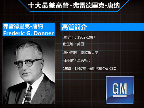 弗雷德里克·唐纳(1902年-1987年)1923年毕业于密歇根大学经济学专业,1926年加入通用汽车公司从事会计师工作,1941年成为通用汽车史上最年轻的副总裁级别高管之一,时年38岁。1958-1967年唐纳成为通用汽车公司第四任CEO。