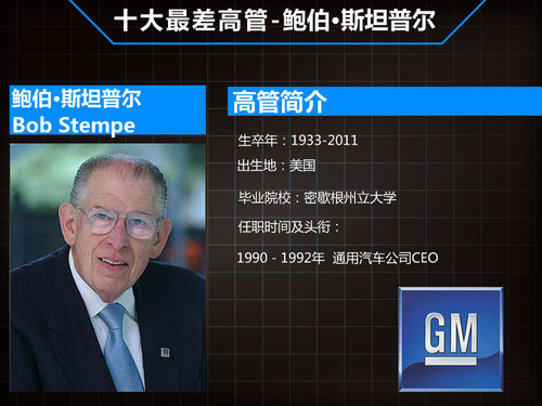 斯坦普尔于1990-1992年间担任通用汽车公司历史上第九任CEO,其前任是之前介绍过的罗杰·史密斯。鲍伯·斯坦普尔从前任手中接过CEO职位时,恰逢伊拉克入侵科威特引发第一次海湾战争,飞涨的油价对美国经济产生了较大影响。面对持续恶化的销售局面,这位CEO拿出21亿美元用于关闭7家工厂,并且签署了事后为人诟病的劳工协议——斯坦普尔想通过提高职工待遇来提高通用汽车的产品质量。此外,斯坦普尔上任之初的改革计划也难以短期见效,上任两年内公司共计亏损44.5亿美元。他被迫再次在3年内削减7.4万个工作岗位、关闭21家工厂。