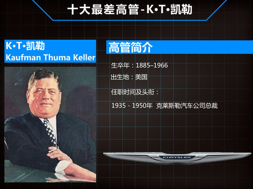 K·T·凯勒(1885年–1966年)于1911年凯勒进入通用汽车,不久之后又进入别克汽车工作,在那里结识了后来克莱斯勒公司的创建者Walter Chrysler,1926年以副总裁的身份加入克莱斯勒汽车公司,1935-1950年凯勒接替Walter Chrysler担任克莱斯勒汽车公司总裁一职。