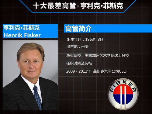 然而,作为2009-2012年间菲斯克汽车公司的CEO,亨利克·菲斯克的表现显然没有作为设计师出色。设计师出身的CEO把设计和营销作为业务核心,而没有找到得力的合作伙伴。此外,亨利克·菲斯克作为CEO并不具备选择电动汽车技术的眼光以及经营风险公司的经验。短短的几年内,菲斯克汽车公司就耗尽了13亿美元的投资,并且生产销售方面没有起色。由于在经营策略方面与管理层出现了较大的分歧,作为公司创始人的亨利克·菲斯克于2013年3月辞去了CEO一职。