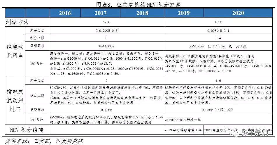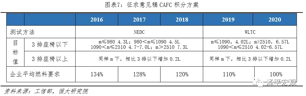 1)传统燃油车油耗趋严,鼓励发展低油耗车型。新《积分办法》将传统燃油车测试方法从NEDC调整为WLTC工况,中汽中心数据显示其油耗将较NEDC工况恶化10.6%。此外,燃料消耗量目标值下调10%左右。