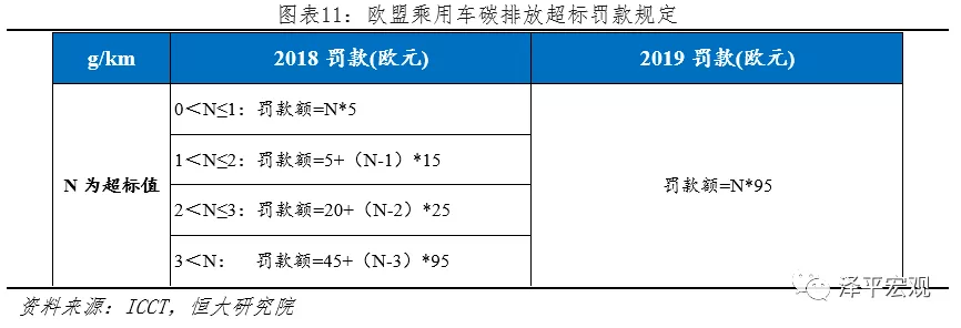 4)罚款力度更重:2018年根据碳排放具体值分阶段处罚,但是从2019年起全部按照最高标准处罚,每超标1g/km罚款95欧。2018年欧盟范围内注册新乘用车碳排放平均值121g/km,销售1562万辆;假设2020年碳排放和销量保持不变,需要罚款(121-95)×1562×95=385.8亿欧元。