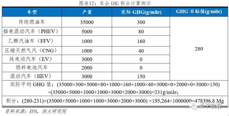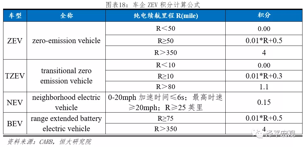 (2)ZEV积分公式:CARB根据下表所示积分公式计算各企业ZEV积分,并进行年度公示。根据《Health and Safety Codesection 43211 civil penalty》条例,对于不满足ZEV积分要求的公司,每个ZEV积分罚款5000美元。