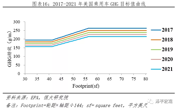 1)CAFE和GHG标准:2010年5月,奥巴马要求美国环保署(EPA)和美国公路安全管理局(NHTSA)根据《Clean Air Act》和《Energy Independence and Security Act of 2007》推行国家级2017-2025年轻型车项目,以提升CAFE和降低GHG排放。其中,EPA负责制定2017-2025年GHG标准,NHTSA负责制定2017-2025年CAFE标准。GHG政策第一阶段“2017-2021”标准已颁布,第二阶段“2022-2025”标准,因2018年4月2号,特朗普政府指责过于严苛,影响就业,需重新修改,新版本暂未公布。CAFE政策第一阶段“2017-2021”标准已颁布,第二阶段“2022-2025”标准中期评估中,暂未公布。CAFE与GHG相似处颇多:1)皆采用积分制,GHG排放低于目标值可获得正积分,反之负积分;2)其标准值皆是分车型、参考汽车占地面积“Footprint”为参考。以GHG标准为例,其2017-2021年乘用车目标值曲线如下,对于不满足GHG标准的车企,根据《Clean Air Act》第205条款,最高可单车罚款37500美元。