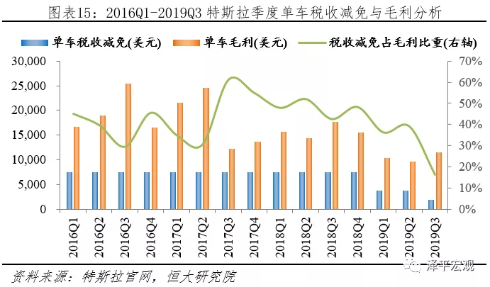 据特斯拉财报披露,2019Q3公司汽车销售毛利率21.78%,单车毛利11525.77美元,税收减免占毛利比重16.27%,税收减免取消后,预计降低毛利率3.54个百分点。