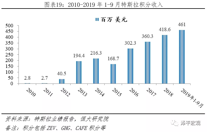 据特斯拉披露,2010-2019Q3特斯拉累计积分销售收入21.68亿美元,其中2016、2017、2018年,ZEV和非ZEV积分收入分别为2.15、0.87,2.80、0.81,1.03、3.15亿美元。