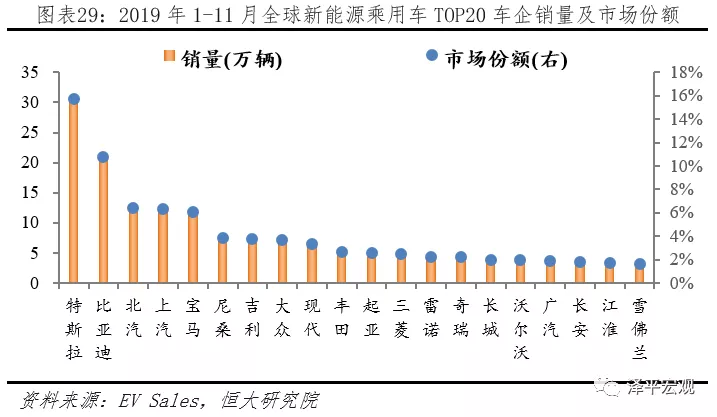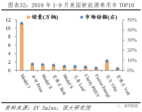 TOP20车型中国占有9席、欧盟占据5席、特斯拉全系上榜、Model 3一枝独秀。据EV Sales统计,2019年1-9月全球新能源乘用车TOP20车型销量从高到低依次为:Model 3、EU系列、元/S2 EV、Leaf、欧蓝德 PHEV、宝骏 E系列、530e/Le、Zoe、Kona EV、宝马i3、唐 PHEV、eQ EV、PriusPHEV、Model X、比亚迪e5、帝豪 EV、e-Golf、荣威 Ei5 EV、欧拉 R1 EV、Model S;对应销量20.80、7.43、6.08、5.38、3.86、3.73、3.68、3.52、3.30、3.06、3.00、2.96、2.87、2.86、2.84、2.73、2.54、2.35、2.26、2.05万辆;其中中国9款,美国3款,日本2款,欧盟5款,韩国1款。