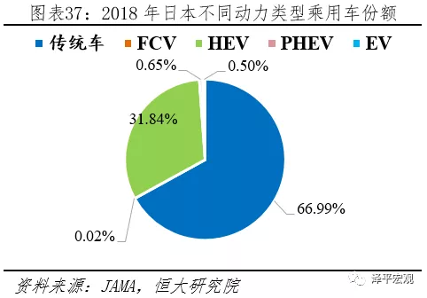 日本新一代汽车HEV占据统治地位。日本由于发动机技术领先,发展HEV有天然优势,故将HEV纳入新一代汽车体系,与EV和PHEV共同发展。据日本汽车销售联合会(JAMA)披露,2018年日本乘用车新车HEV、EV、PHEV、FCV、传统车销量分别为92.18、1.46、1.88、0.06、193.97万辆,分别占比66.99%、31.84%、0.65%、0.50%、0.02%。