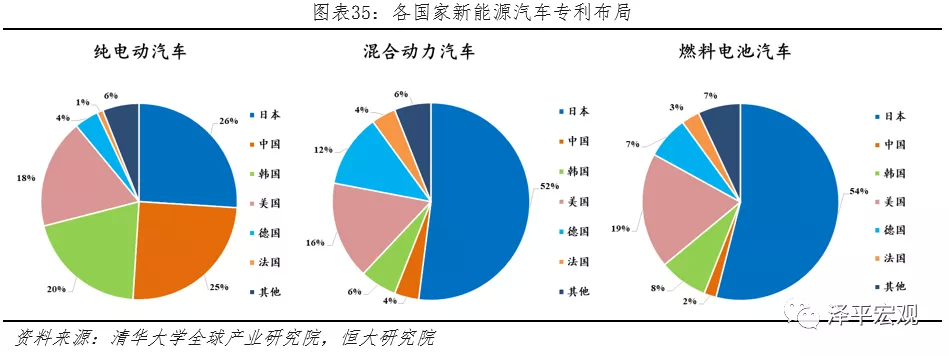 专利是技术实力的象征,也是企业前瞻性布局的体现。2019年10月,清华大学全球产业研究院发布《新能源汽车全球专利观察》报告指出,到2019年7月全球各国,在BEV车型方向专利件数占比分别为:日本26%、中国25%、韩国20%、美国18%、德国4%、法国1%;HEV车型方向专利件数占比分别为:日本52%、中国4%、韩国6%、美国16%、德国12%、法国4%;FCV车型方向:日本54%、中国2%、韩国8%、美国19%、德国7%、法国3%。